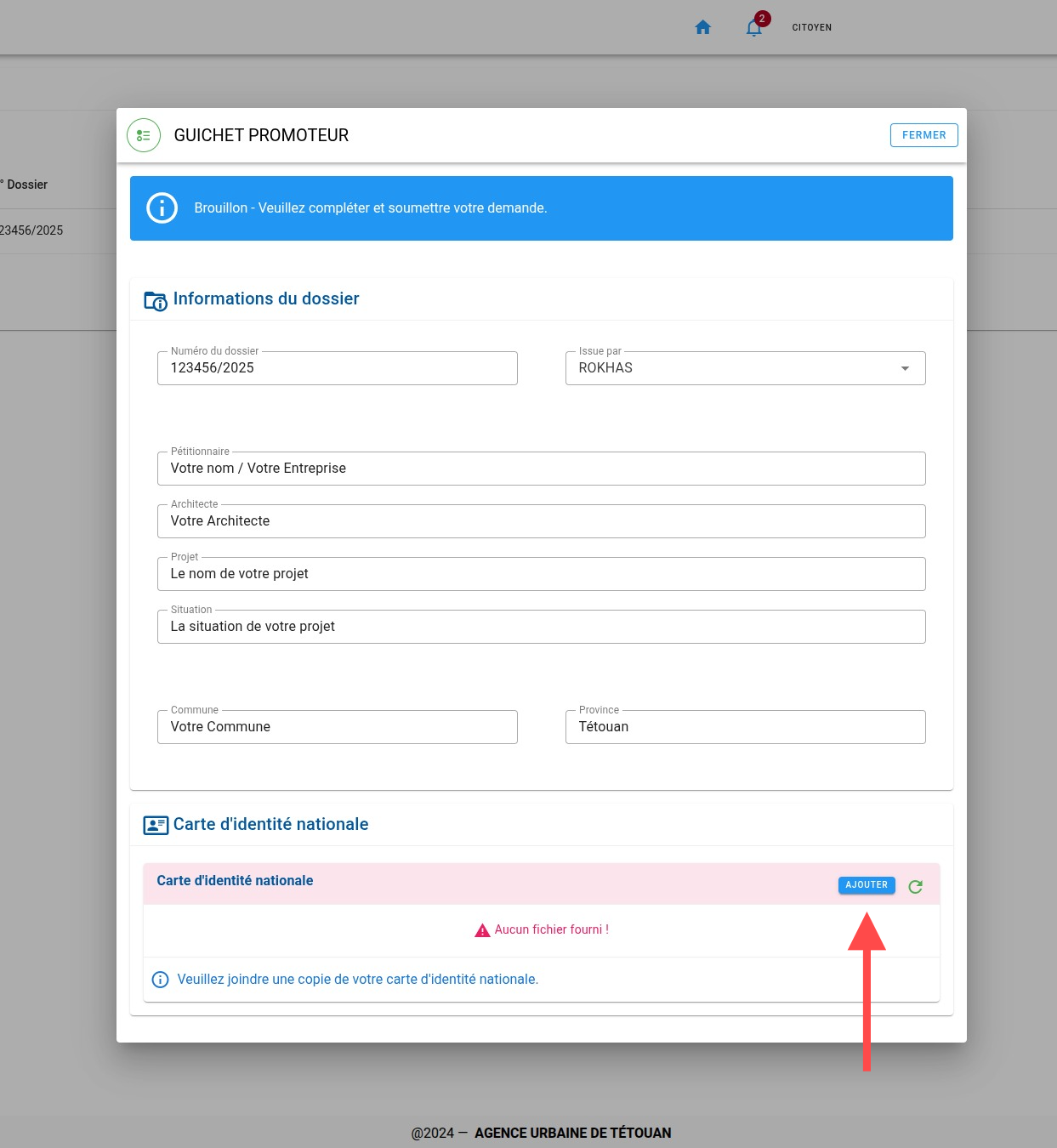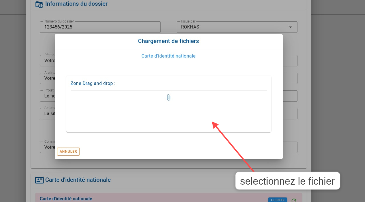 Chargez les fichiers demandés. ces fichiers varient selon le type de la demande.